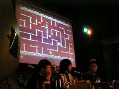 続いてのゲストは元ゲーム批評編集長の小野憲史氏です。「どうしてゲーム批評を辞められたのですか」というのっけからの質問に、何もかも包み隠さず話してしまって「ワッハッハ」な小野サン、相変わらず正直者です! で、小野サンおすすめのファミコンソフトは、洋ゲーだったのでしっかりとはタイトルを覚えていないのですが、確か「フォステージ」とかいう名前で、敵のアジトに忍び込んで組織を壊滅させるという内容のゲームでした。「これなら任せて下さいよ」と大きなことを言って出てきた小野サンでしたが、最初の侵入シーンから死にまくって失笑を買っています。しかし最終的には1ゲームクリアすることができてめでたしめでたし。 超能力者の清田氏も開発に携わったという超能力開発ソフト「マインドシーカー」の話題になったときは、元「HiPPON SUPER!」誌読者のジョッカーアキラこと、気功師毒拳氏がステージ上に上がり、実は先日清田氏にあったばかりだが、「あのゲームはなかったことにしてくれ」とのことだったというコメントを伝えます。HiPPON SUPER! 元読者掲示板で既にこの話題は出ていたのですが、より詳しい内容を聞かせていただくことができて大変面白かったです。当時、清田氏ご本人は、本気で超能力開発ソフトに取り組んだそうですが、清田氏の力をどのようにしてプログラムというディジタル情報に変換したかは全くの謎。 続いてステージ上には、主婦イラストレーター・マンガ家として、そして鈴木みそ氏のアシスタントとしてご活躍中のはやのん氏が登場。取り出すゲームソフトがどれも二本ずつなのですが、なぜかというと、ダンナも持っていたので有名どころはみんなカブってしまうという。オタク(ほめ言葉)どうしの結婚とはそういうものかと、みな妙に納得。しかし、カブっちゃうんですよねーと言いながら最後に取り出した2本のソフトが「超人ウルトラベースボール」だったのは、あなた方それ絶対変です(最大級のほめ言葉)。 途中休憩時間には、掲示板でお会いした元HiPPON読者の方々にごあいさつ。いやもう皆々様当時HiPPONを読まれていたころ、こうしてお互い出会うようなことになるとは思いもしなかったわけで。おまけにこんなアクの強いイベントで。というわけで、このイベントをハネた後オフ会開催決定。おおっと、客席の比較的近い位置に先ほどの小野サンがやってきました。以前お会いしてからかなり経っていますが、赤尾研の者ですと名乗るとすぐに話が通じたので嬉しかったです。師匠が行方不明(謎)で申し訳ないです。 その後もレアなゲームがたくさん出てきて大変面白かったのですが、登場した個々のソフトの説明はカカキッシ氏のページにゆずるとして、私が特に興味深かったのは、「高橋名人vs毛利名人」の映画をテクノに乗せて編集したビデオでした。元の映画は、前半に両名人の修行シーンがあって、後半は実際の対戦の模様を納めてあるのですが、その後半は記録としては価値があるものの、楽しんで鑑賞するにはちょっとダルかったのです。それがこの編集ビデオでは、テクノに乗せて対戦シーンをどんどん早回しにして流し、その中にうまく修行シーンを織り交ぜてあって、大変テンポよく両方のシーンを楽しめます。ビッグスターブレインに16連射で挑む高橋名人のアップ画面から、連射により指だけでスイカを割ろうとする画面に突然変わると会場は大爆笑、見事にスイカが割れると拍手の渦でした。会場中が高橋萌エ〜。 お客さんもソフトを持ってどんどんステージに上がり、自慢のネタを披露します。いやーそれにしても全体を通して感じたのが、みんな持ってくるネタ自体確かに面白いものばかりなのですが、それ以上に、それぞれ自分なりの紹介の仕方が面白い。なんというか、ちゃんと落としどころを心得て、面白い点をうまくまとめて紹介しています。それで、話しながらプレイするとミスしたりして「あれっおかしいな」ということが多いのですが、それがかえってバカ度を上げていてますます面白い。そんなに人を笑わかすのが集まっているとも思いにくいので、やっぱりこれは対象への愛の深さがなせる技なのでしょうね。 7:30に始まったのですが、終了は12:00前で、ほぼ4時間半にわたってファミコンのノンストッププレイでした。本当にいつ来てもプラスワンは面白い。催事の内容自体が面白いのもさることながら、ここへ集まってくる人たちとのつながりはなお面白い。我々は聖地に巡礼しにくるピルグリムといったところか。さてさて、この時間になると当然私はもう浜松へ帰りようがないので、こりゃ朝まで飲みだなという。いやもうハイネケンを5杯も飲んでいるのですけどね。プラスワンではいい話を聞けるものですから、ついついたくさん飲んで出演者に還元したくなり、料理注文しなくても3000円とか4000円とかになってしまう。っていうかいつでも飲みたいだけでしょうが。 その後、はやのん氏・毒拳
